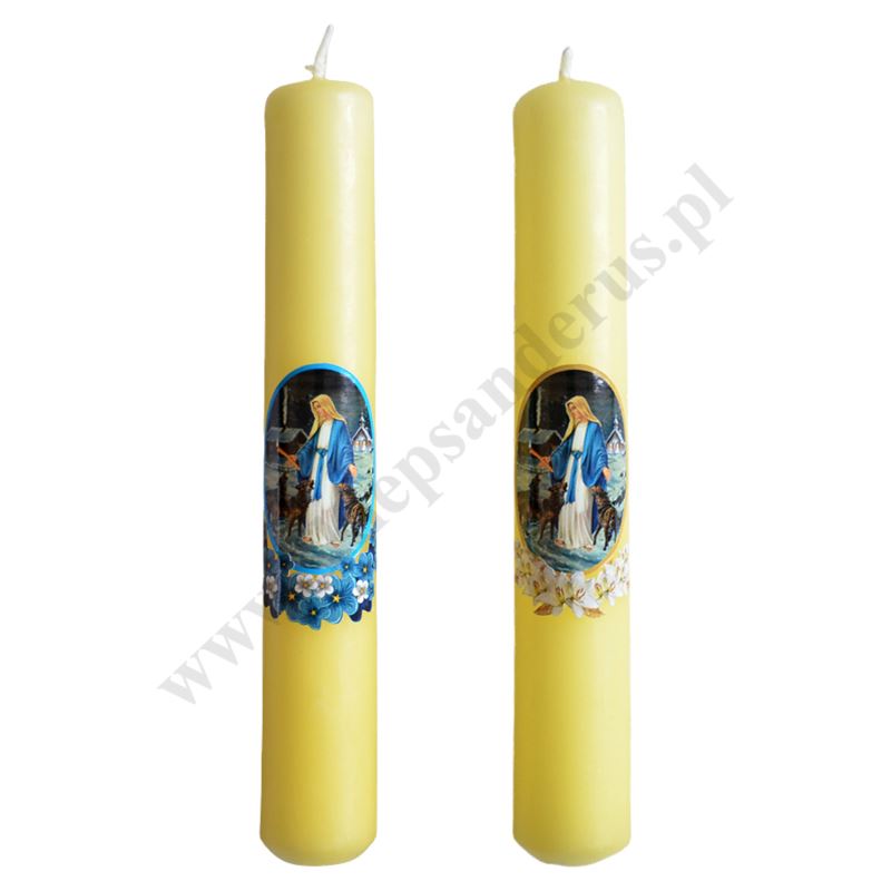 Gromnica parafinowa żółta z ozdobną naklejką Matki Bożej. Długość świecy 19 cm, średnica świecy 3 cm. Sprzedaż w mixie wzorów.