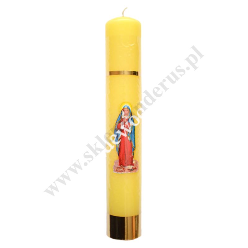 Gromnica parafinowa, żółta z ozdobną naklejką Matki Bożej. Długość świecy 27 cm, średnica świecy 4.7 cm