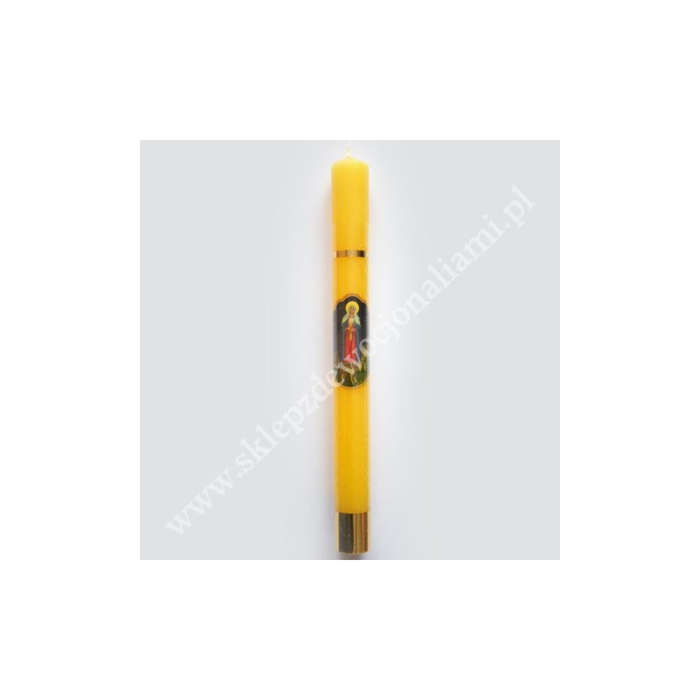 Gromnica parafinowa, żółta z ozdobną naklejką Matki Bożej. Długość świecy 28.5 cm, średnica świecy 2.9 cm