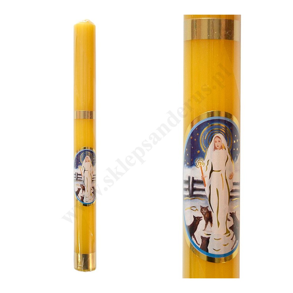 Gromnica parafinowa, żółta z ozdobną naklejką Matki Bożej. Długość świecy 30 cm, średnica świecy 3 cm