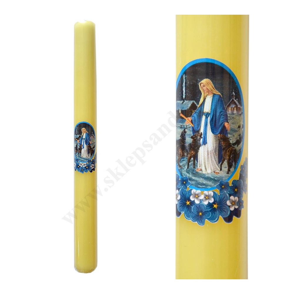 Gromnica parafinowa żółta z ozdobną naklejką Matki Bożej. Długość świecy 30 cm, średnica świecy 3 cm