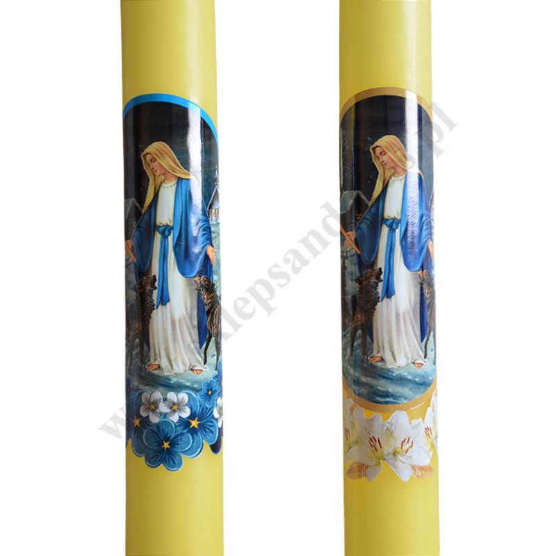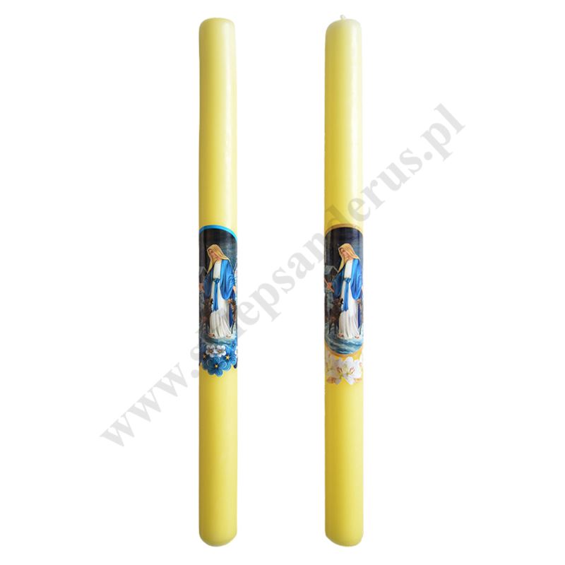 Gromnica parafinowa żółta z ozdobną naklejką Matki Bożej. Długość świecy 40 cm, średnica świecy 3 cm, sprzedaż w miksie wzorów.
