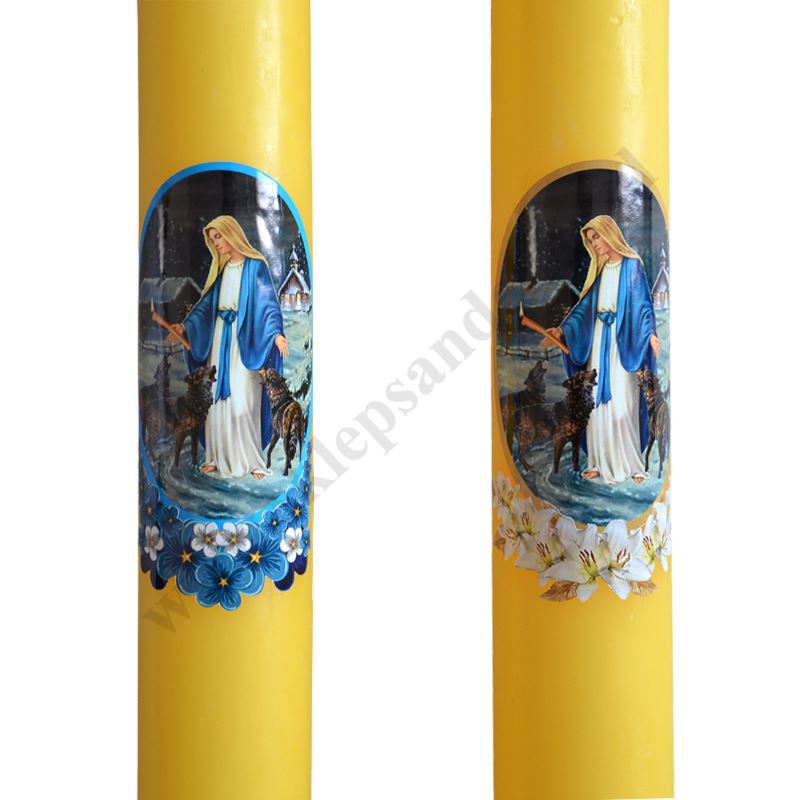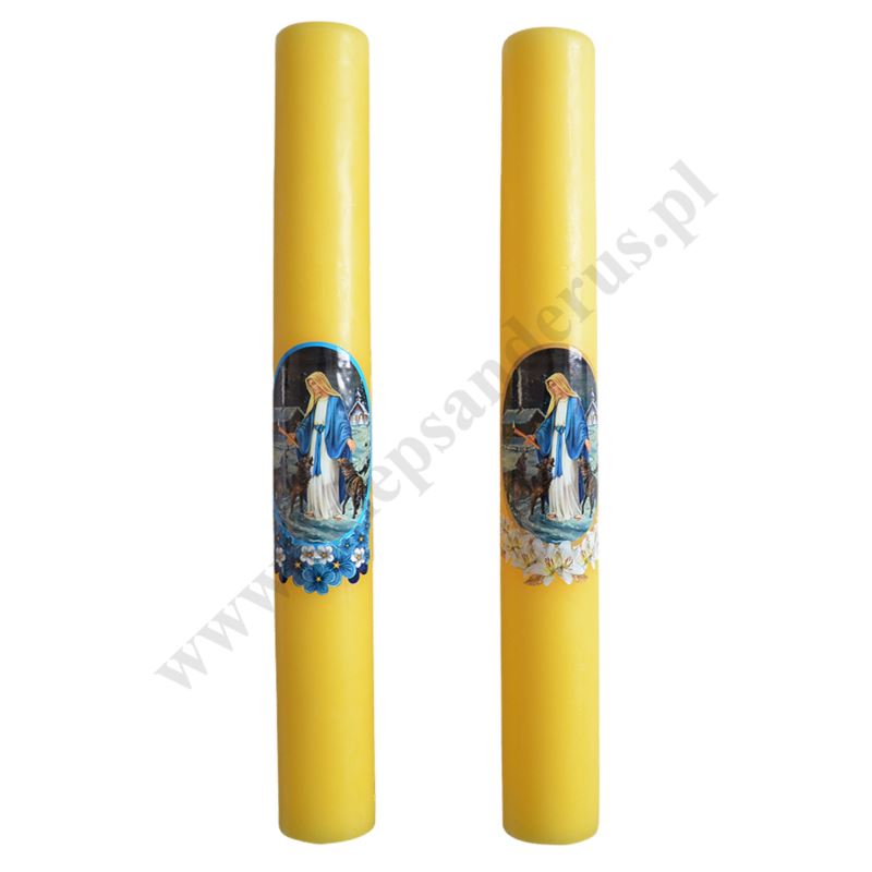 Gromnica parafinowa żółta o wysokości 40 cm i średnicy 5 cm, zdobiona naklejką z wizerunkiem Matki Bożej Gromnicznej. Sprzedaż w miksie wzorów.