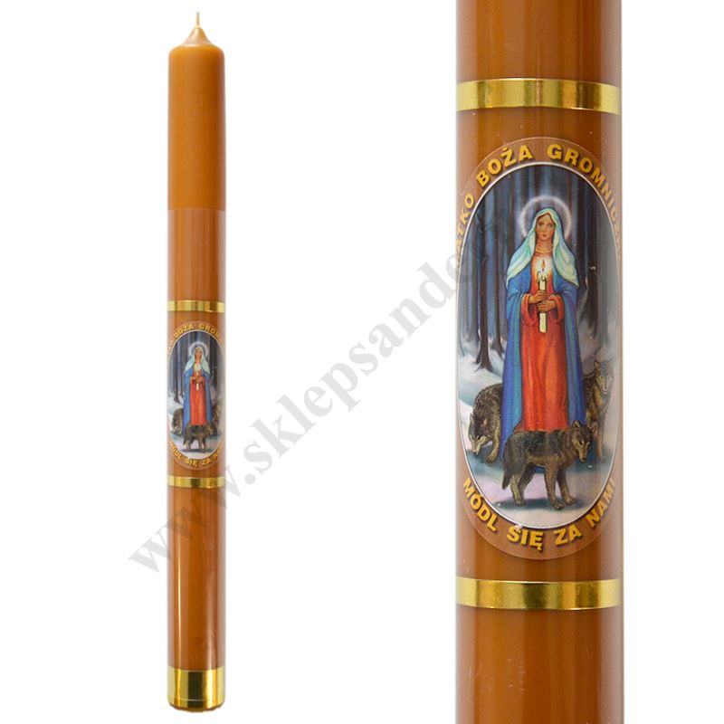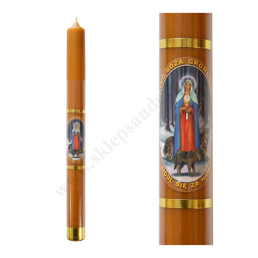 Gromnica parafinowo-woskowa o wysokości 35 cm i średnicy 3 cm zdobiona naklejką z wizerunkiem Matki Bożej Gromnicznej.