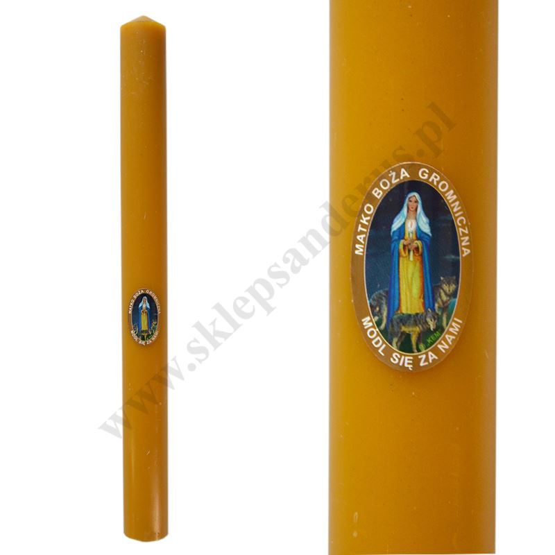 Gromnica parafinowo-woskowa o wysokości 40 cm i średnicy 3.5 cm zdobiona naklejką z wizerunkiem Matki Bożej Gromnicznej.