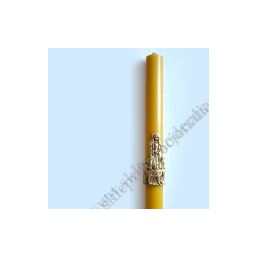 Gromnica woskowa o wysokości 40 cm i średnicy 3.5 cm z parafinową, przestrzenną aplikacją Matki Bożej Gromnicznej.