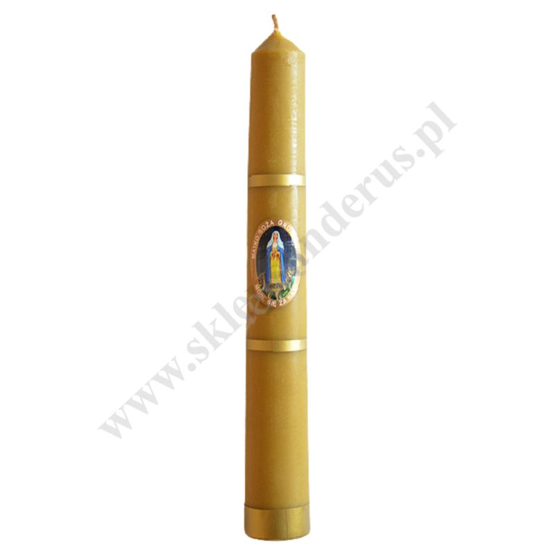 Gromnica woskowa o wysokości 24 cm i średnicy 3 cm, zdobiona naklejką z wizerunkiem Matki Bożej gromnicznej.