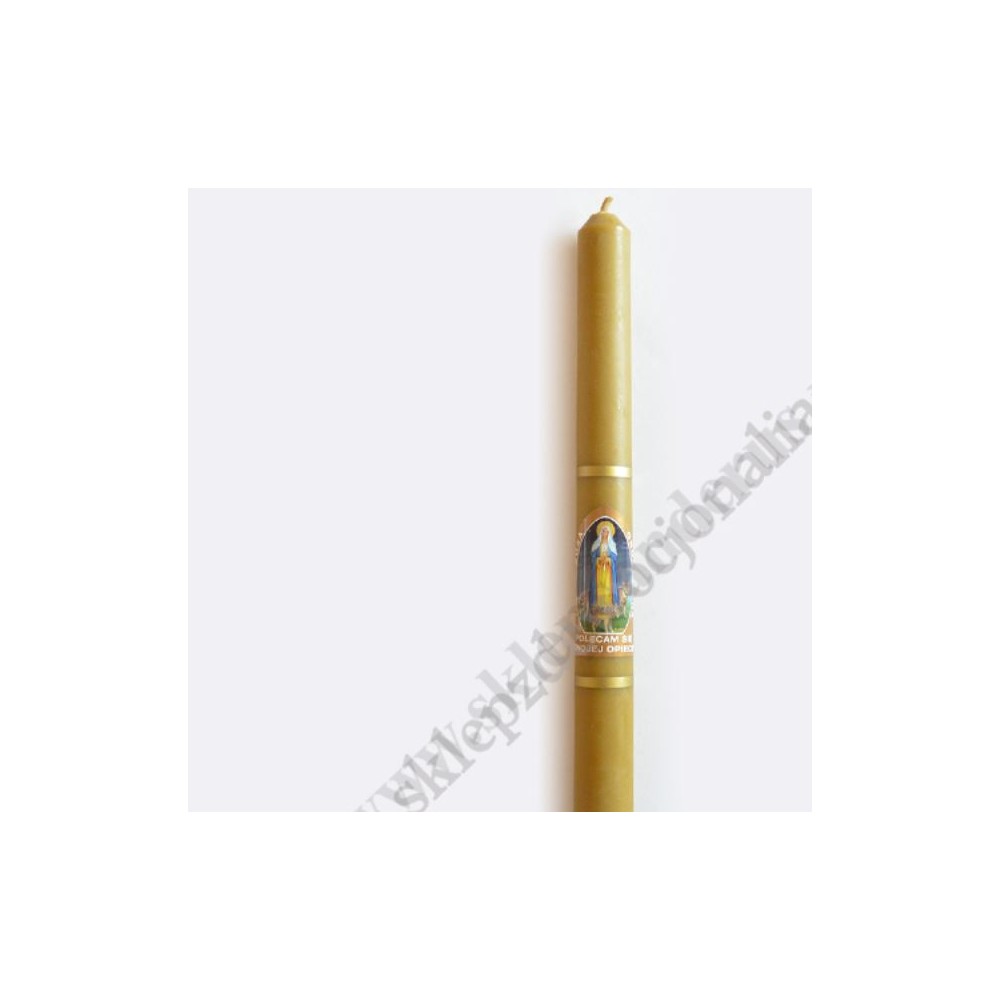 Gromnica woskowa o wysokości 40 cm i średnicy 3 cm, zdobiona naklejką z wizerunkiem Matki Bożej gromnicznej.