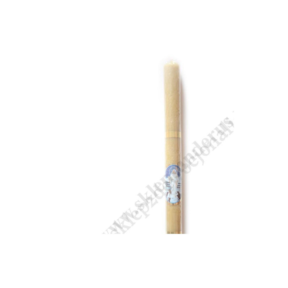 Gromnica woskowa z ozdobną naklejką Matki Bożej. Długość świecy 40 cm, średnica świecy 3 cm.