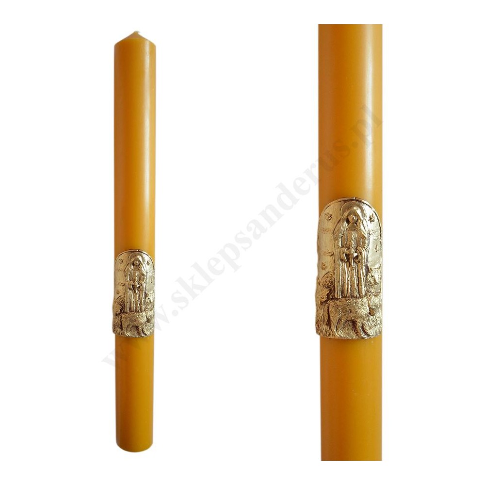 Świeca gromniczna woskowa z domieszką parafiny o wysokości 50 cm i średnicy 5 cm zdobiona przestrzenną aplikacją parafinową przedstawiającą wizerunek Matki Bożej Gromnicznej.