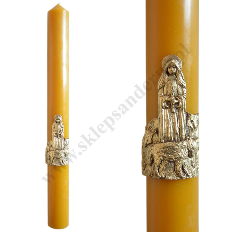 Gromnica woskowa z domieszką parafiny z ozdobną aplikacją Matki Bożej. Długość świecy 45 cm, średnica świecy 4.5 cm
