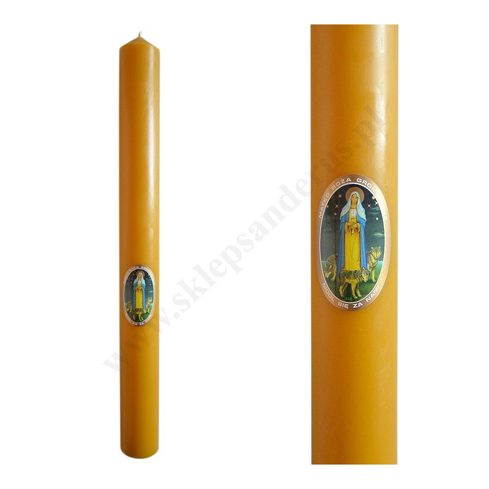 Gromnica woskowa z domieszką parafiny z ozdobną naklejką Matki Bożej. Długość świecy 50 cm, średnica świecy 5 cm.