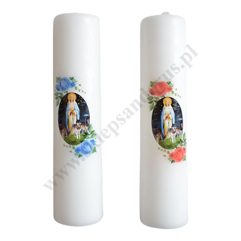 Gromnica parafinowa o wysokości 20 cm i średnicy 4.8 cm z ozdobną naklejką przedstawiającą Matkę Bożą Gromniczną. Sprzedaż w miksie wzorów.