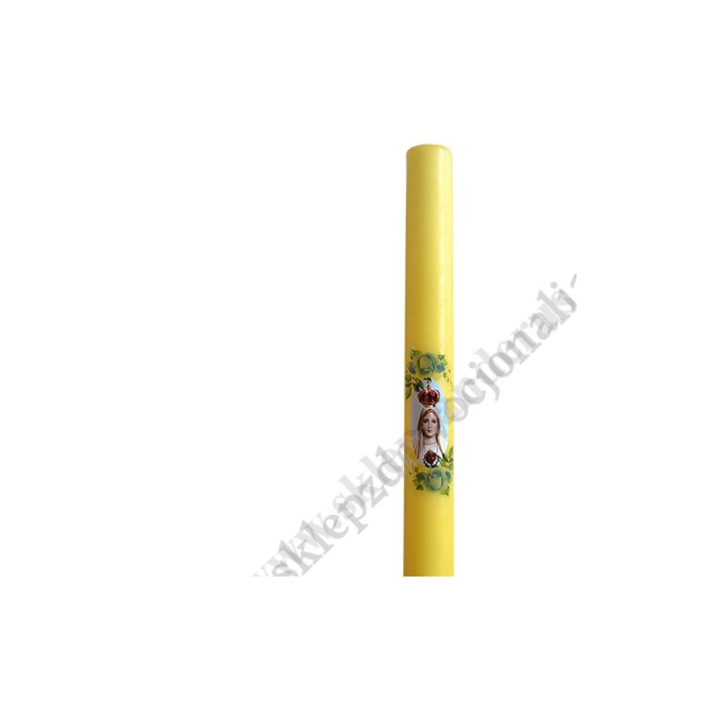 Świeca gromniczna prafonowa o wysokości 30 cm i średnicy 3 cm, zdobiona naklejką z wizerunkiem Matki Bożej Fatimskiej.