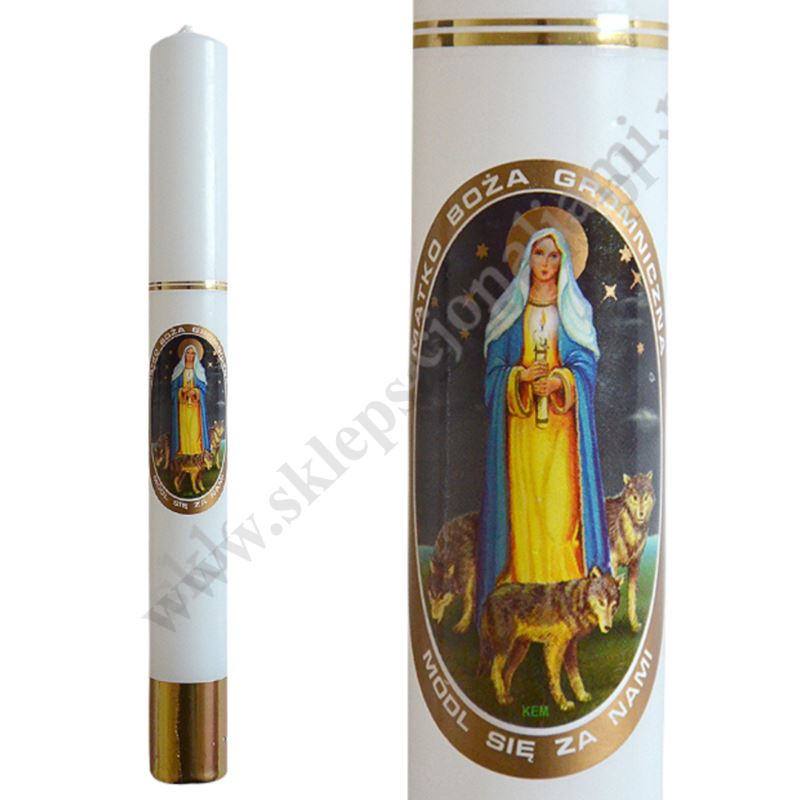 Gromnica parafinowa w kolorze białym o wysokości 30 cm i średnicy 3.2 cm, zdobiona naklejką z wizerunkiem Matki Bożej Gromnicznej.