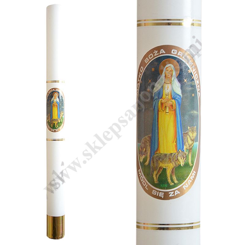 Gromnica parafinowa w kolorze białym o wysokości 40 cm i średnicy 3.2 cm, zdobiona naklejką z wizerunkiem Matki Bożej Gromnicznej.