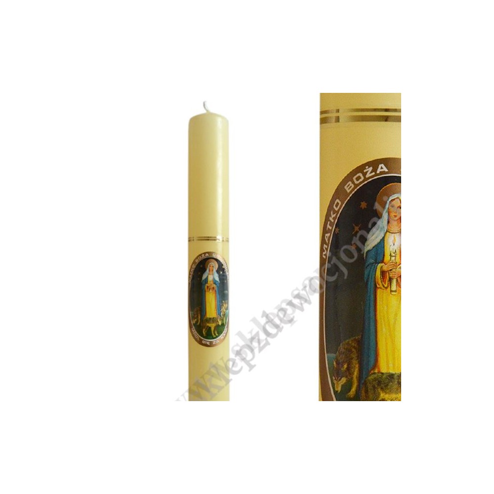 Gromnica parafinowa w kolorze ecru o wysokości 30 cm i średnicy 3.2 cm, zdobiona naklejką z wizerunkiem Matki Bożej Gromnicznej.