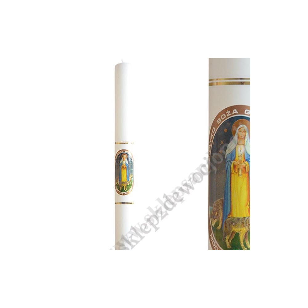 Gromnica parafinowa w kolorze białym o wysokości 40 cm i średnicy 3.2 cm, zdobiona naklejką z wizerunkiem Matki Bożej Gromnicznej.