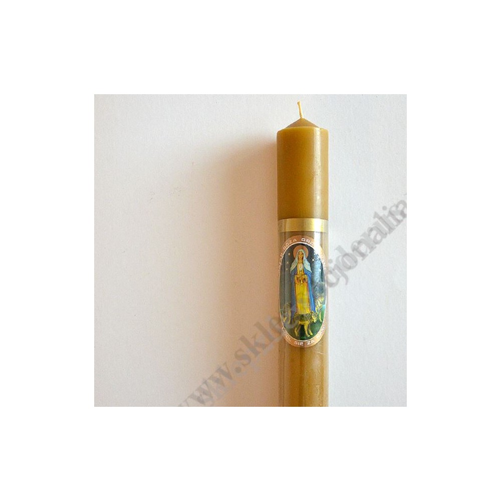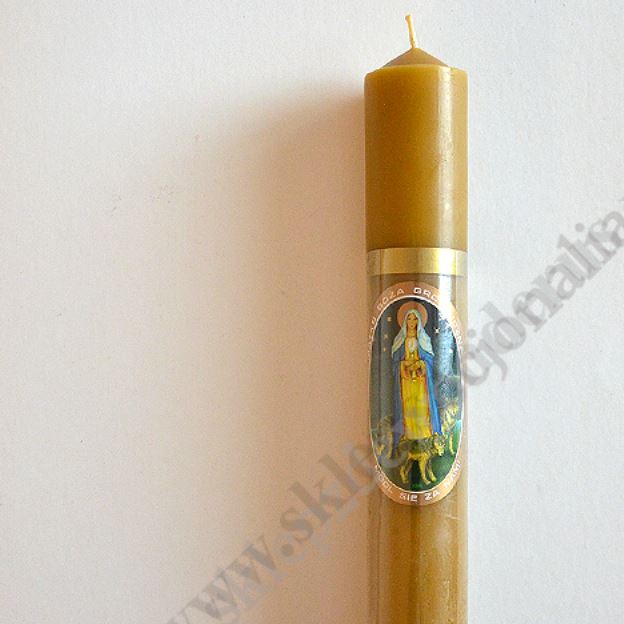 Gromnica z woskiem o wysokości 24 cm i średnicy 3.5 cm zdobiona naklejką z wizerunkiem Matki Bożej Gromnicznej z wilkami.