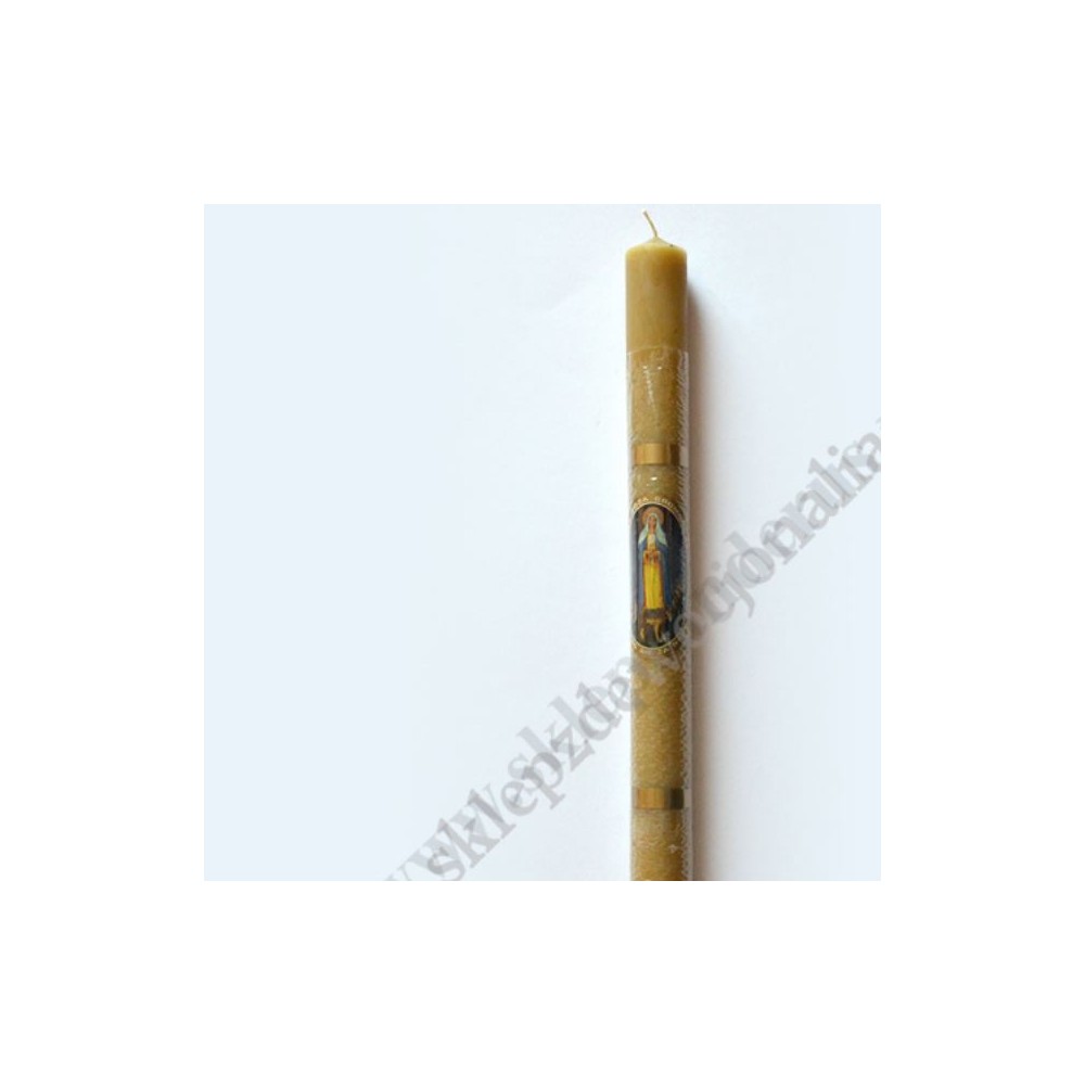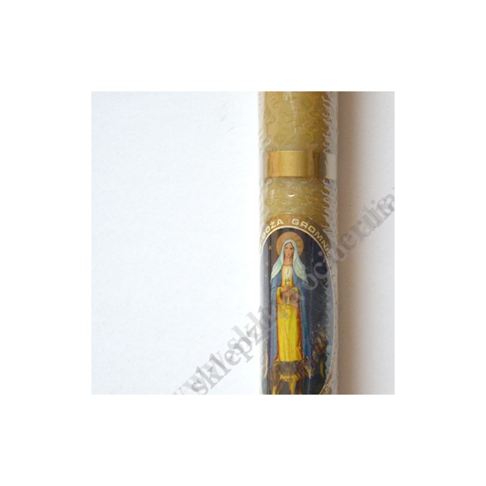 Gromnica z woskiem o wysokości 38 cm i średnicy 2.7 cm zdobiona naklejką z wizerunkiem Matki Bożej Gromnicznej z wilkami.