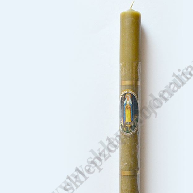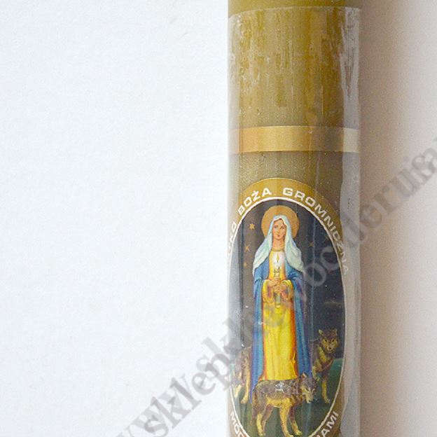 Gromnica z woskiem o wysokości 40 cm i średnicy 3.5 cm zdobiona naklejką z wizerunkiem Matki Bożej Gromnicznej z wilkami.