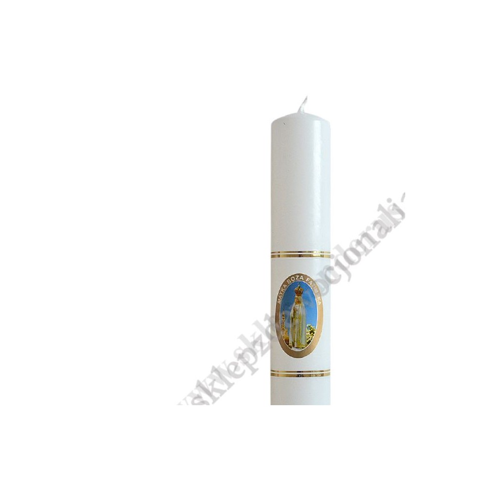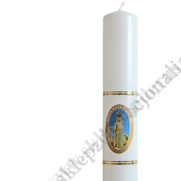 Gromniczka parafinowa fatimska o wysokości 20 cm i średnicy 3.2 cm zdobiona naklejką z wizerunkiem Matki Bożej Fatimskiej.