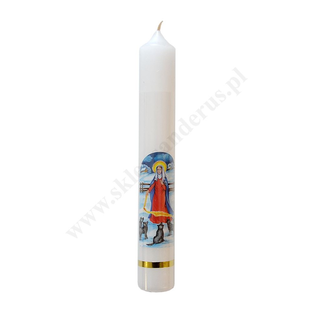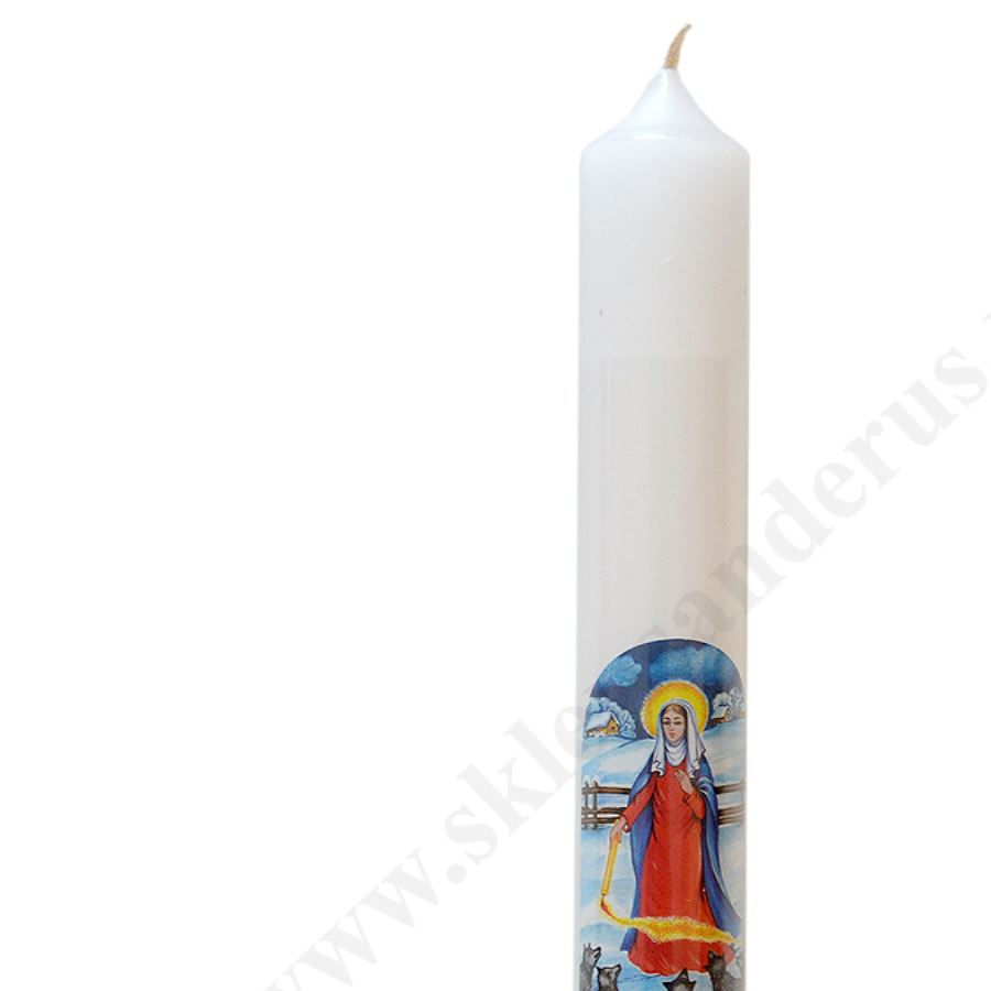 Gromniczka parafinowa w kolorze białym o wysokości 20 cm i średnicy 3 cm, zdobiona naklejką z wizerunkiem Matki Bożej Gromnicznej.