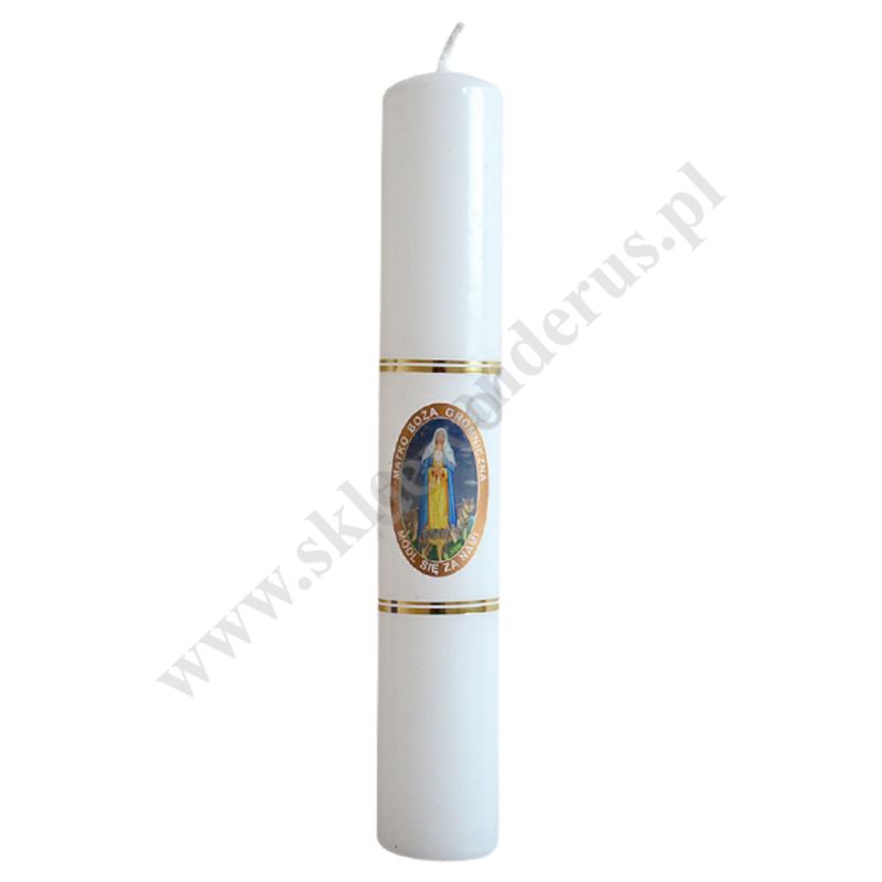 Gromniczka parafinowa w kolorze białym o wysokości 20 cm i średnicy 3.2 cm, zdobiona naklejką z wizerunkiem Matki Bożej Gromnicznej.