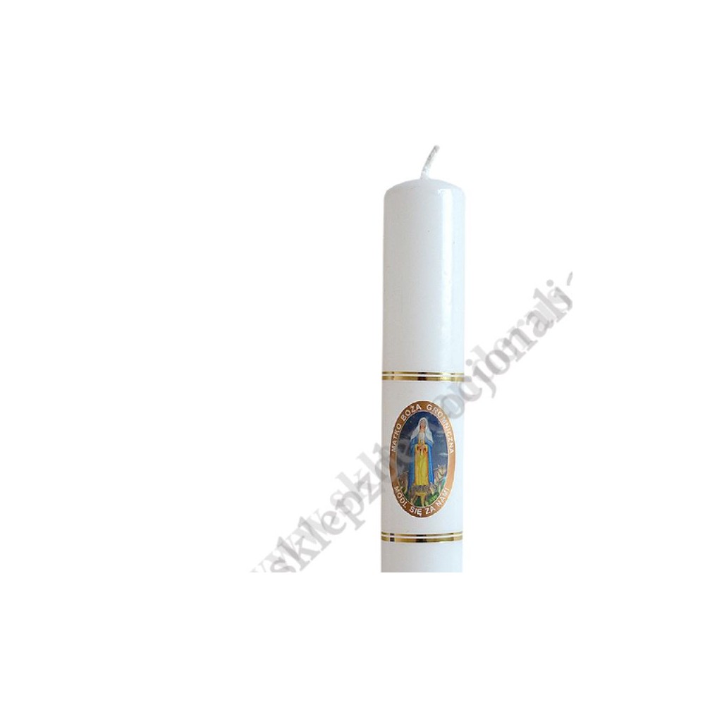 Gromniczka parafinowa w kolorze białym o wysokości 20 cm i średnicy 3.2 cm, zdobiona naklejką z wizerunkiem Matki Bożej Gromnicznej.