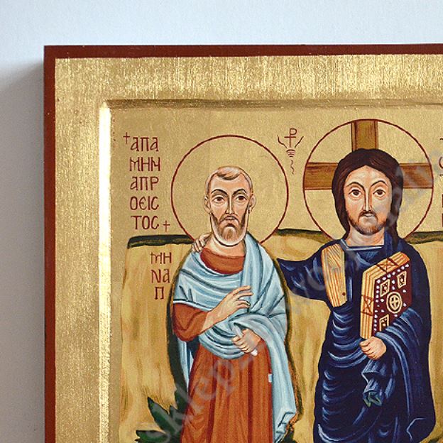 Ikona przyjaźni przedstawiająca Jezusa Chrystusa i Św.Menasa w rozmiarze 23 x 23 cm. PONIŻEJ W PRODUKTACH POWIĄZANYCH ISTNIEJE MOŻLIWOŚĆ ZAMÓWIENIA OKAZJONALNEJ DEDYKACJI NA TABLICZCE SREBRNEJ LUB ZŁOTEJ.