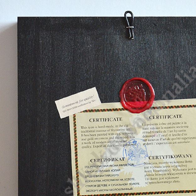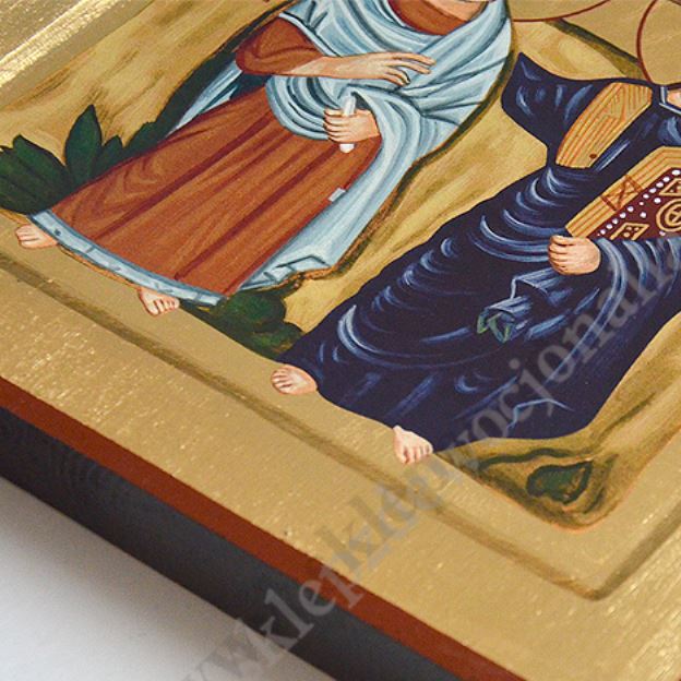 Ikona Przyjaźni przedstawiająca Jezusa Chrystusa i Św.Menasa w wymiarze 23 x 23 cm. Ikona ręcznie wykonana na płótnie lnianym wklejonym w drewno. Tło ikony jest wykonane ze sproszkowanego złota. Grubość deski 2.5 cm. Ikona tylko do powieszenia.