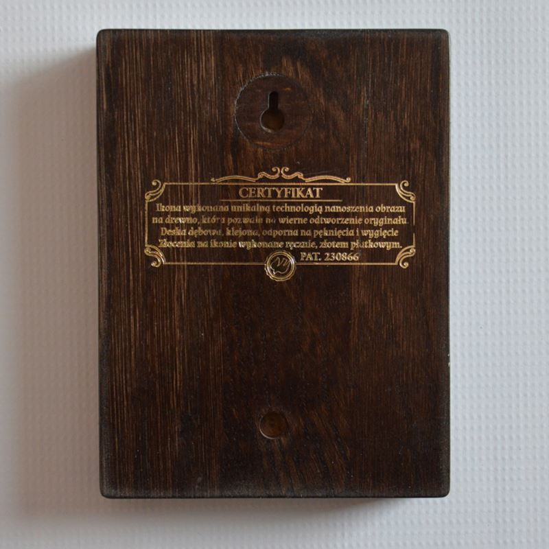 Ikona o wymiarach 11.9 x 16 cm, grubość deski 2.4 cm. Ikona z możliwością powieszenia lub postawienia. PONIŻEJ W PRODUKTACH POWIĄZANYCH ISTNIEJE MOŻLIWOŚĆ ZAMÓWIENIA OKAZJONALNEJ DEDYKACJI NA TABLICZCE SREBRNEJ LUB ZŁOTEJ.