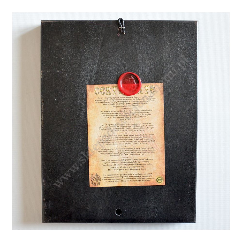 Ikona przedstawiająca Jezusa Dobrego Pasterza w wymiarze 24 x 31 cm. Ikona ręcznie wykonana na płótnie lnianym wklejonym w drewno. Tło ikony jest wykonane ze sproszkowanego złota. Grubość deski 2.5 cm.