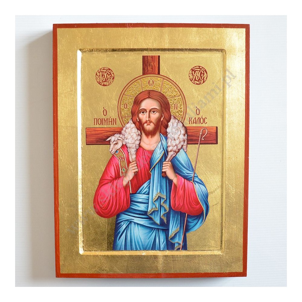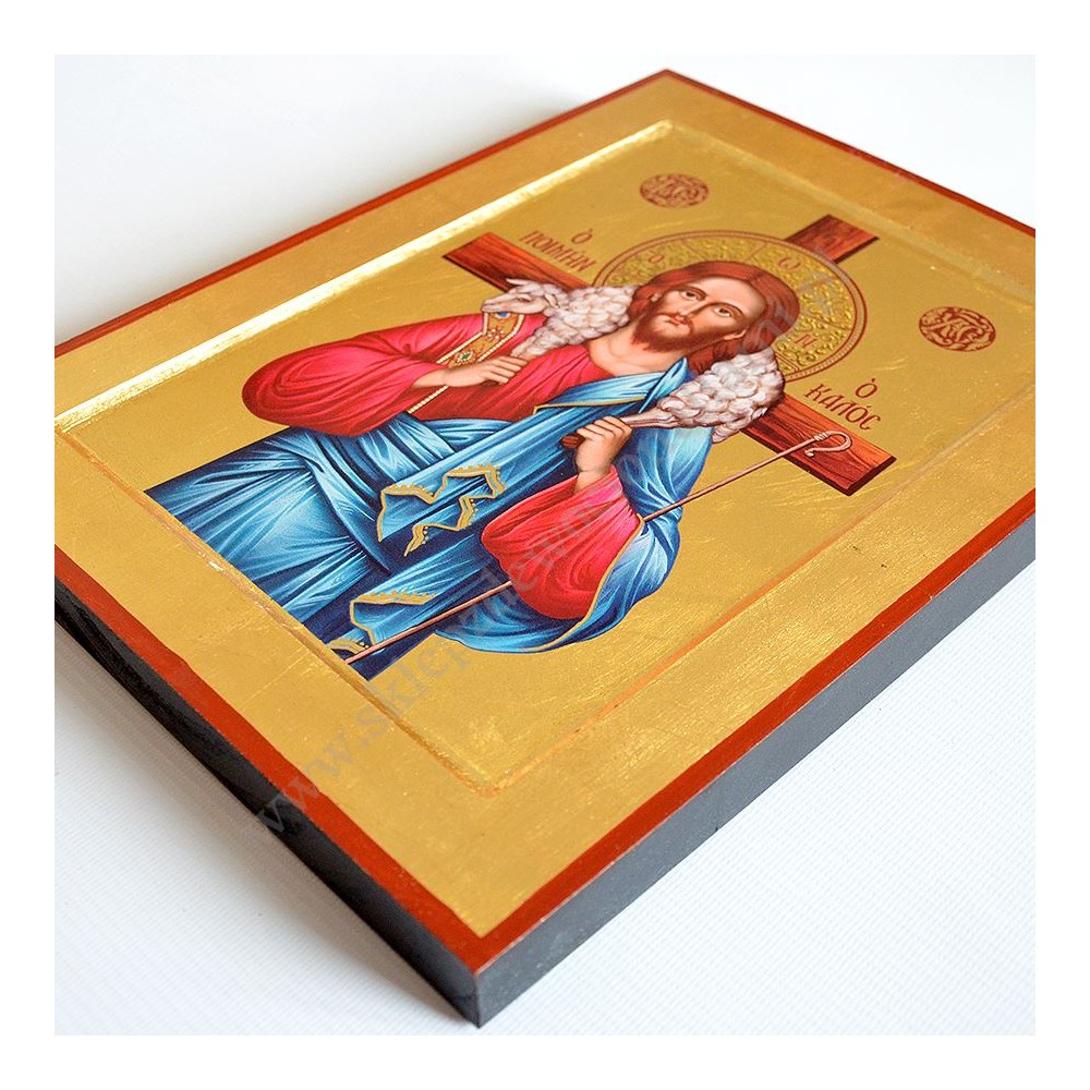 Ikona przedstawiająca Jezusa Dobrego Pasterza w wymiarze 24 x 31 cm. PONIŻEJ W PRODUKTACH POWIĄZANYCH ISTNIEJE MOŻLIWOŚĆ ZAMÓWIENIA OKAZJONALNEJ DEDYKACJI NA TABLICZCE SREBRNEJ LUB ZŁOTEJ.