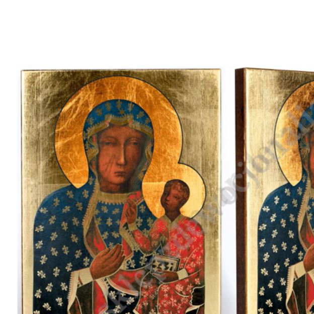 Ikona Matki Bożej Częstochowskiej o wymiarch 17 cm x 23 cm wykonana jest unikalną techniką nanoszenia obrazu na drewno. Nadruk wyróżnia się głębią koloru oraz charakterystycznymi wklęsłymi złoceniami.