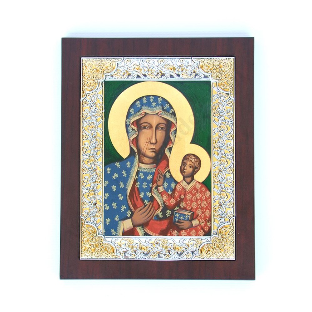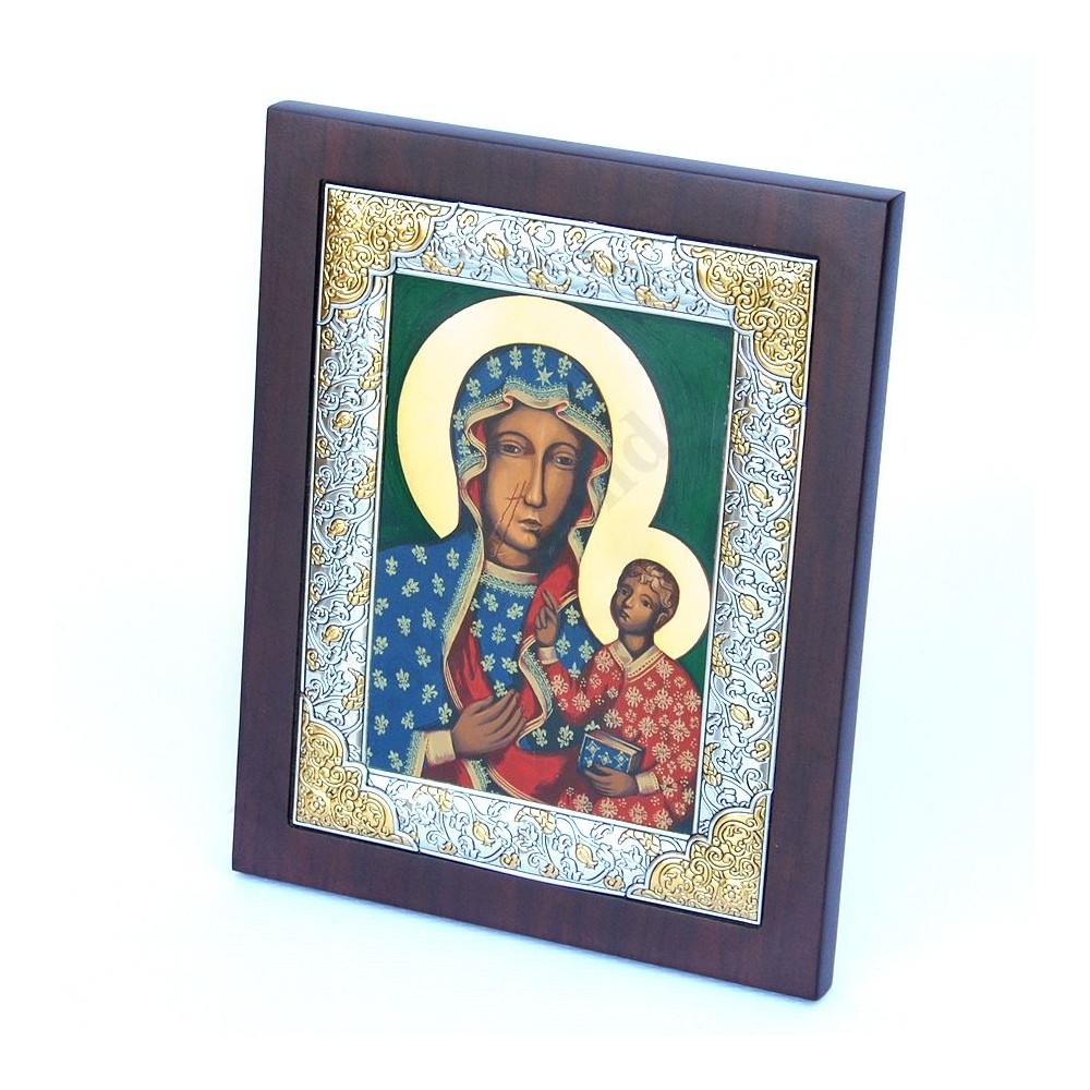 Ikona Matki Bożej Częstochowskiej wykonana techniką sitodruku w drewnie, oprawiona wytłaczanym stopem z naniesioną warstwą srebra w drewnianej ramie.