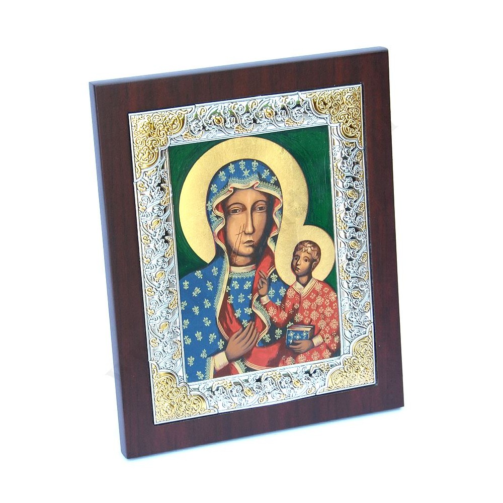 Ikona Matki Bożej Częstochowskiej wykonana techniką sitodruku w drewnie, oprawiona wytłaczanym stopem z naniesioną warstwą srebra w drewnianej ramie. PONIŻEJ W PRODUKTACH POWIĄZANYCH ISTNIEJE MOŻLIWOŚĆ ZAMÓWIENIA OKAZJONALNEJ DEDYKACJI...