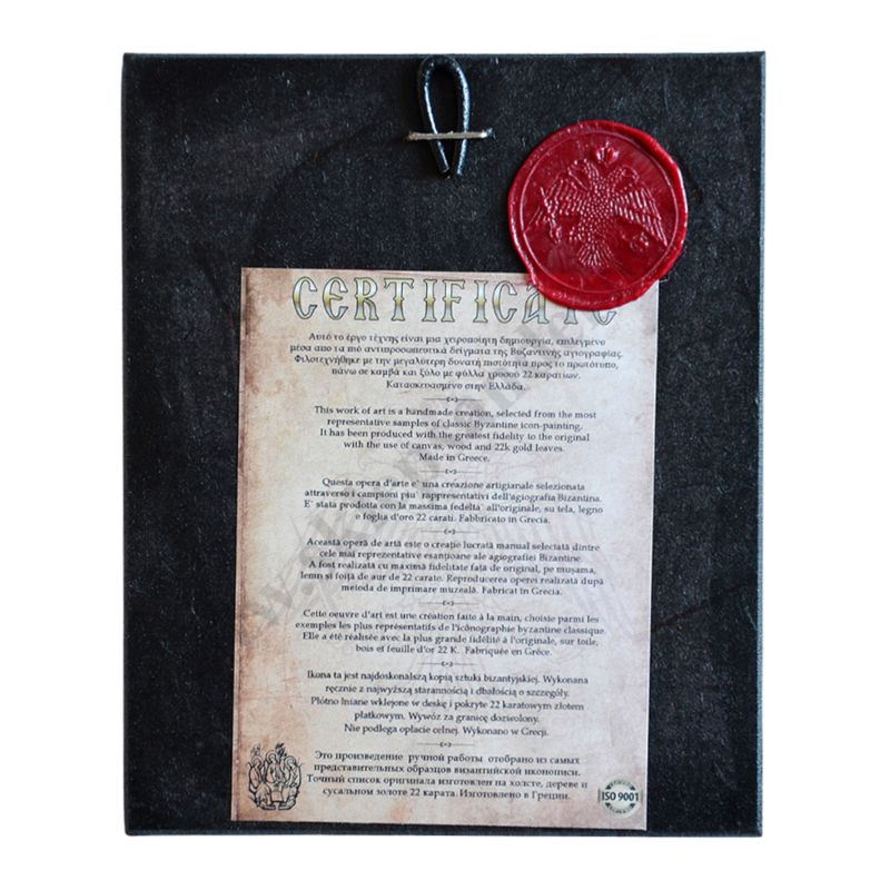 Ikona przedstawiająca Matkę Bożą Czułą w wymiarze 10.3 x 12.5 cm. Ikona ręcznie wykonana na płótnie lnianym wklejonym w drewno. Tło ikony jest wykonane ze sproszkowanego złota. Grubość deski 1.5 cm.