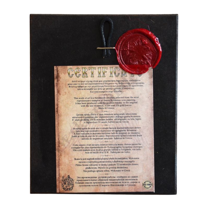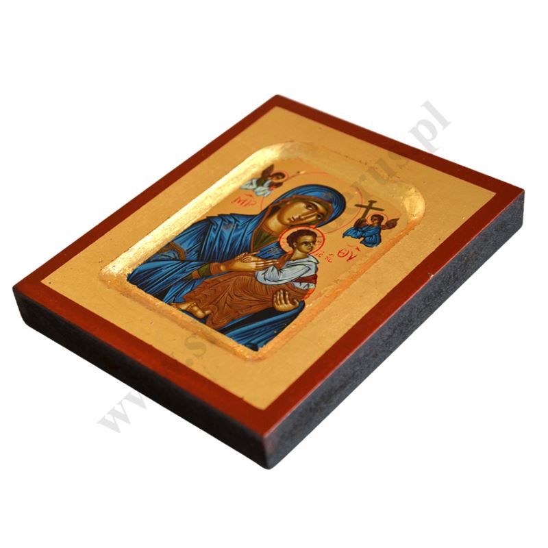Ikona przedstawiająca wizerunek Matki Bożej Nieustającej Pomocy o wymiarze 10.3 x 12.5 cm. Ikona ręcznie wykonana na płótnie lnianym wklejonym w drewno. Tło ikony jest wykonane ze sproszkowanego złota. Grubość deski 1.5 cm.
