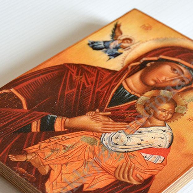 Ikona Matki Bożej Nieustającej Pomocy o wymiarach 13 x 17 x 1.8 cm wykonana techniką decoupage z ręcznym podmalowywaniem.