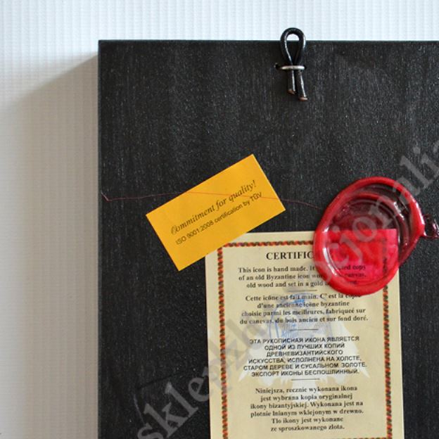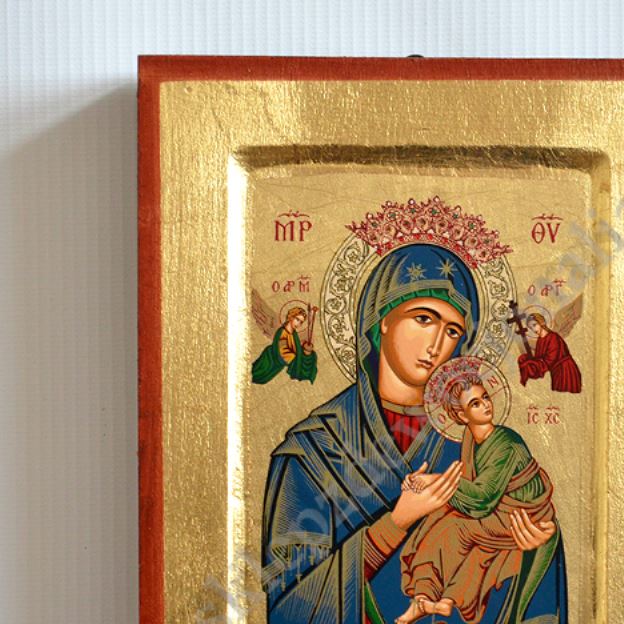 Ikona Matki Bożej Nieustającej Pomocy 14 x 18 cm. Ikona ręcznie wykonana na płótnie lnianym wklejonym w drewno. Tło ikony jest wykonane ze sproszkowanego złota. Grubość deski 2.5 cm.