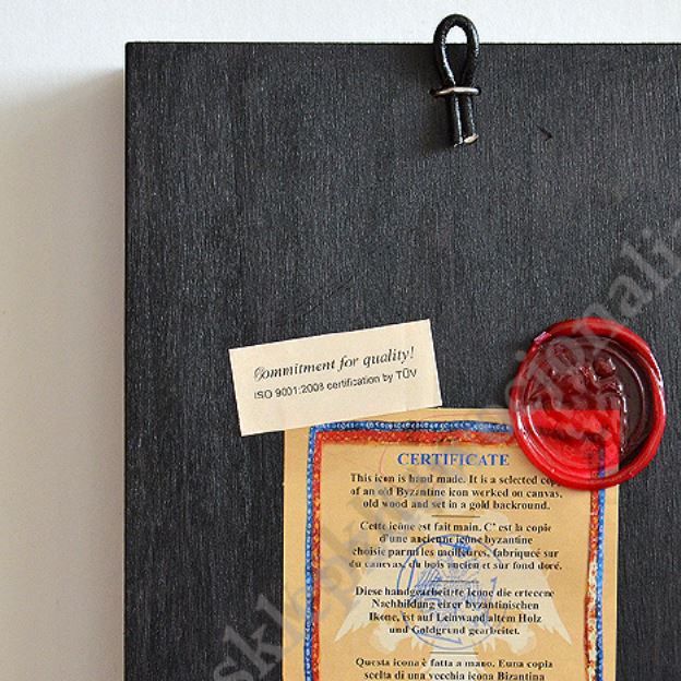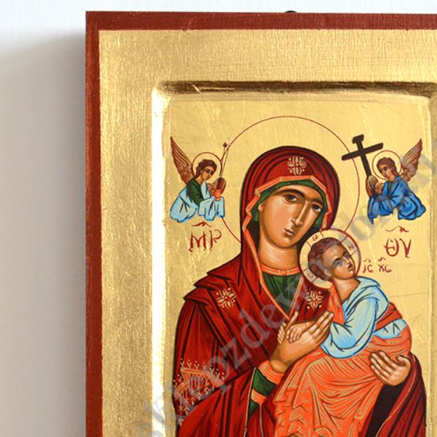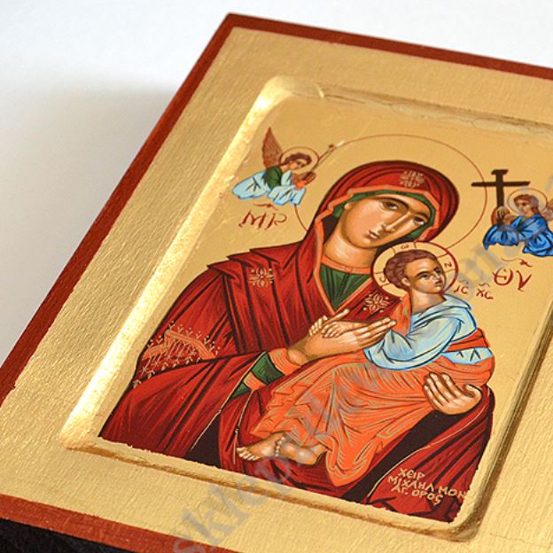 Ikona Matki Bożej Nieustającej Pomocy w wymiarze 14 x 18 cm. Ikona ręcznie wykonana na płótnie lnianym wklejonym w drewno. Tło ikony jest wykonane ze sproszkowanego złota. Grubość deski 2.3 cm. Ikona do powieszenia jak i postawienia.