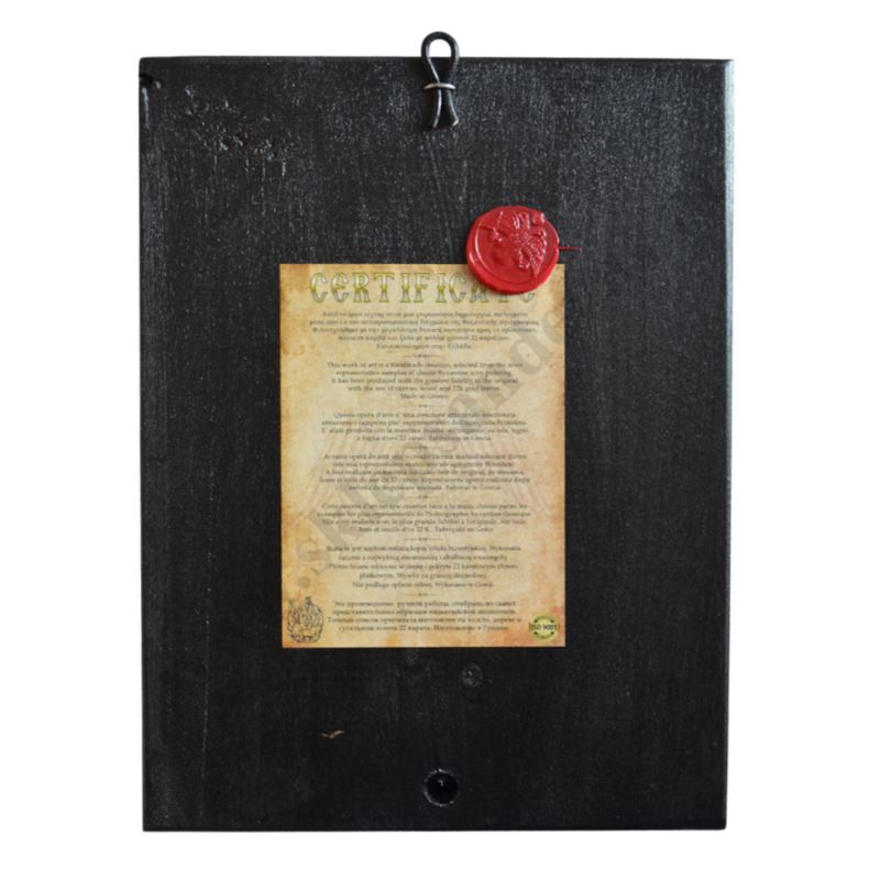 Ikona Matki Bożej Nieustającej Pomocy w wymiarze 18 x 23.5 cm. Ikona ręcznie wykonana na płótnie lnianym wklejonym w drewno. Tło ikony jest wykonane ze sproszkowanego złota. Grubość deski 2.4 cm.