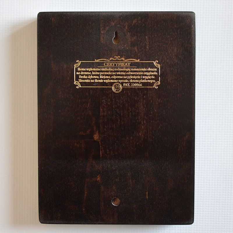 Ikona wykonana unikalną technologią nanoszenia obrazu na drewno, która pozwala na wierne odtworzenie oryginału. Deska olchowa, lita klejona, odporna na pęknięcia i wygięcia. Złocenia na ikonie wykonane ręcznie, złotem płatkowym.