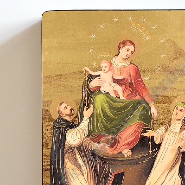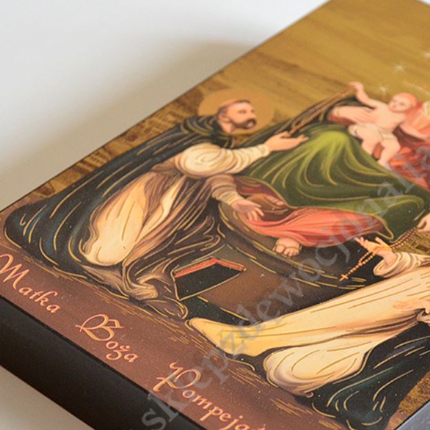 Ikona Matki Bożej Pompejańskiej o wymiarch 12 cm x 16 cm wykonana jest unikalną techniką nanoszenia obrazu na drewno. PONIŻEJ W PRODUKTACH POWIĄZANYCH ISTNIEJE MOŻLIWOŚĆ ZAMÓWIENIA OKAZJONALNEJ DEDYKACJI NA TABLICZCE SREBRNEJ LUB ZŁOTEJ.