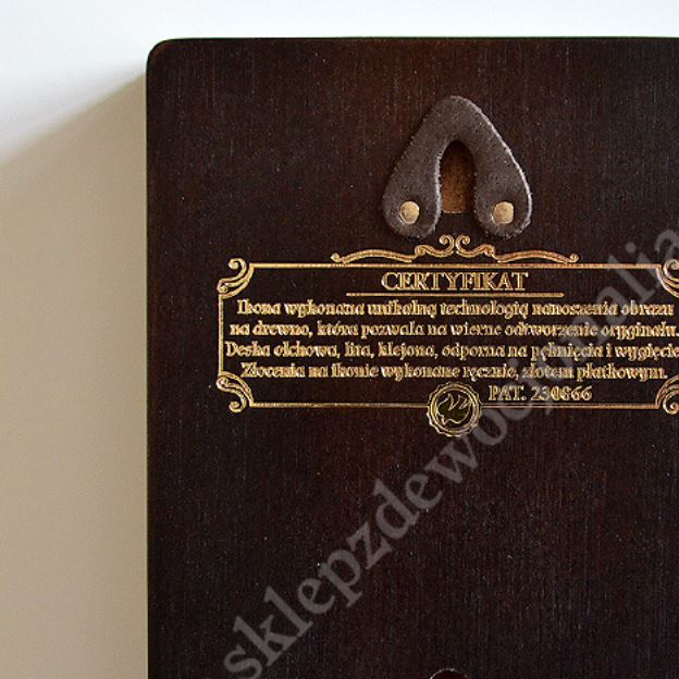 Prezentowana ikona wykonana jest unikalną techniką nanoszenia obrazu na drewno. Nadruk wyróżnia się głębią koloru oraz charakterystycznymi wklęsłymi złoceniami.