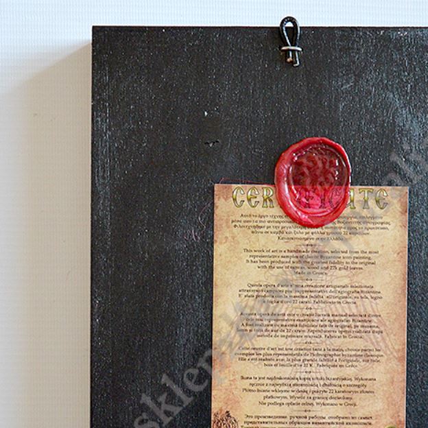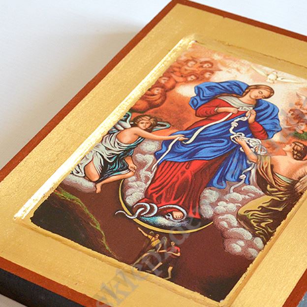 Ikona Matki Bożej Rozwiązującej Węzły w wymiarze 18 x 24 cm. Ikona ręcznie wykonana na płótnie lnianym wklejonym w drewno. Tło ikony jest wykonane ze sproszkowanego złota. Grubość deski 2.3 cm. Ikona do powieszenia jak i postawienia.