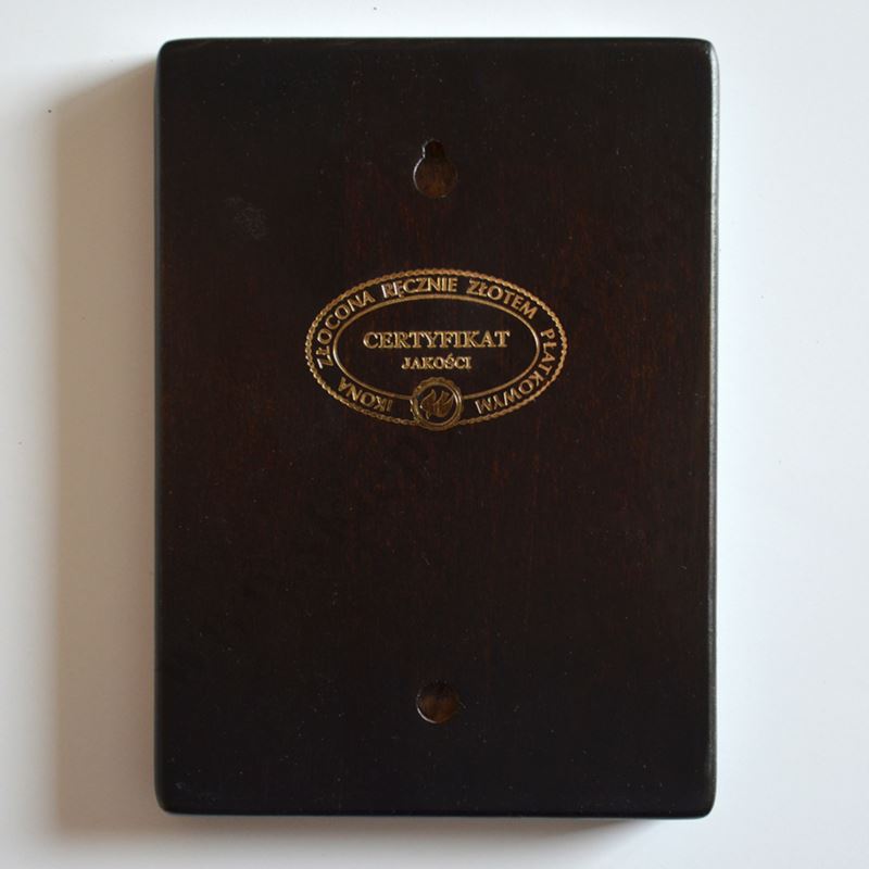 Ikona wykonana unikalną technologią nanoszenia obrazu na drewno, która pozwala na wierne odtworzenie oryginału. Deska olchowa, lita klejona, odporna na pęknięcia i wygięcia. Złocenia na ikonie wykonane ręcznie, złotem płatkowym.