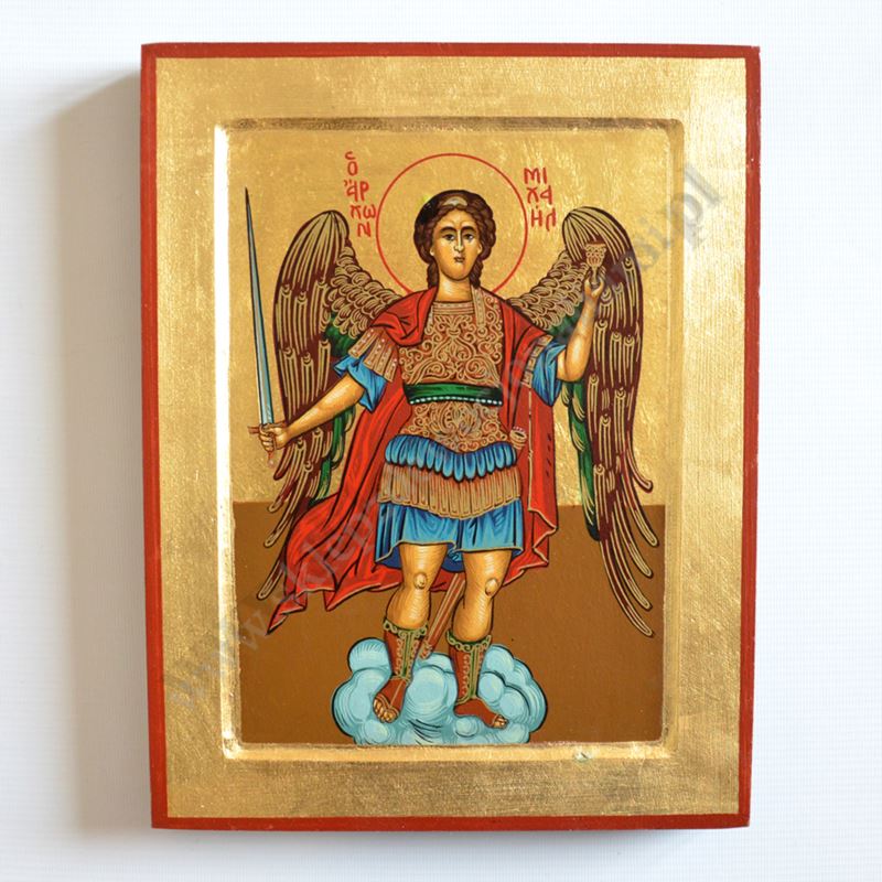 Ikona przedstawiająca Michała Archanioła w wymiarze 24 x 31 cm. Ikona ręcznie wykonana na płótnie lnianym wklejonym w drewno. Tło ikony jest wykonane ze sproszkowanego złota. Grubość deski 2.5 cm.
