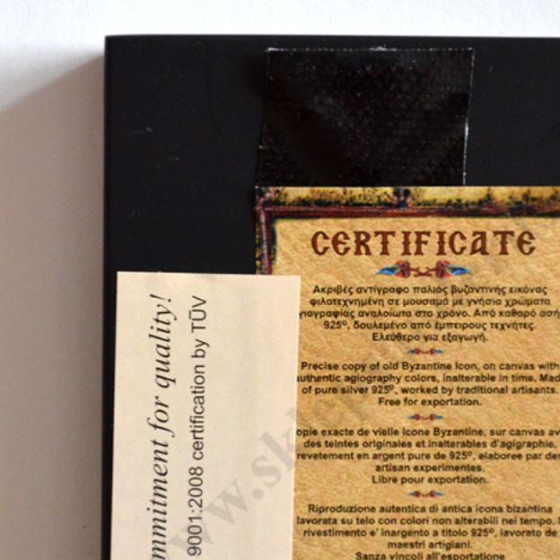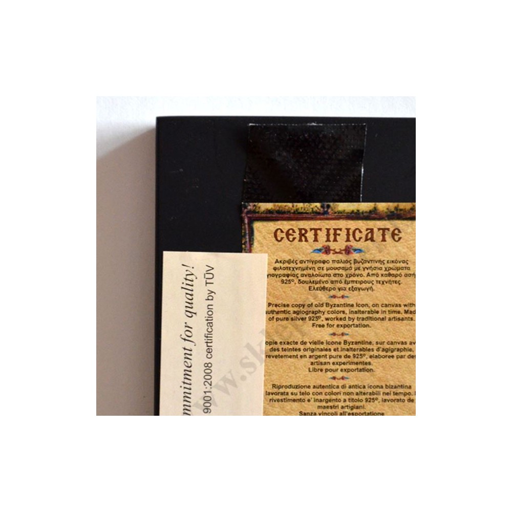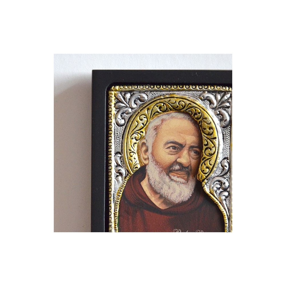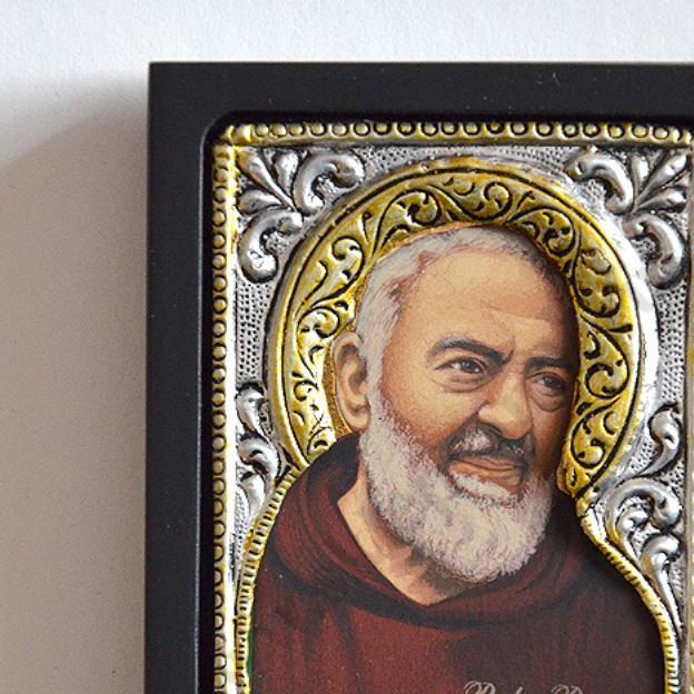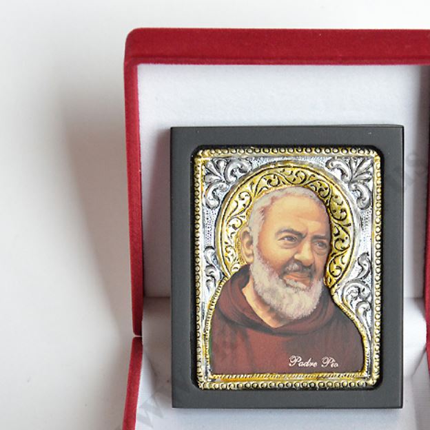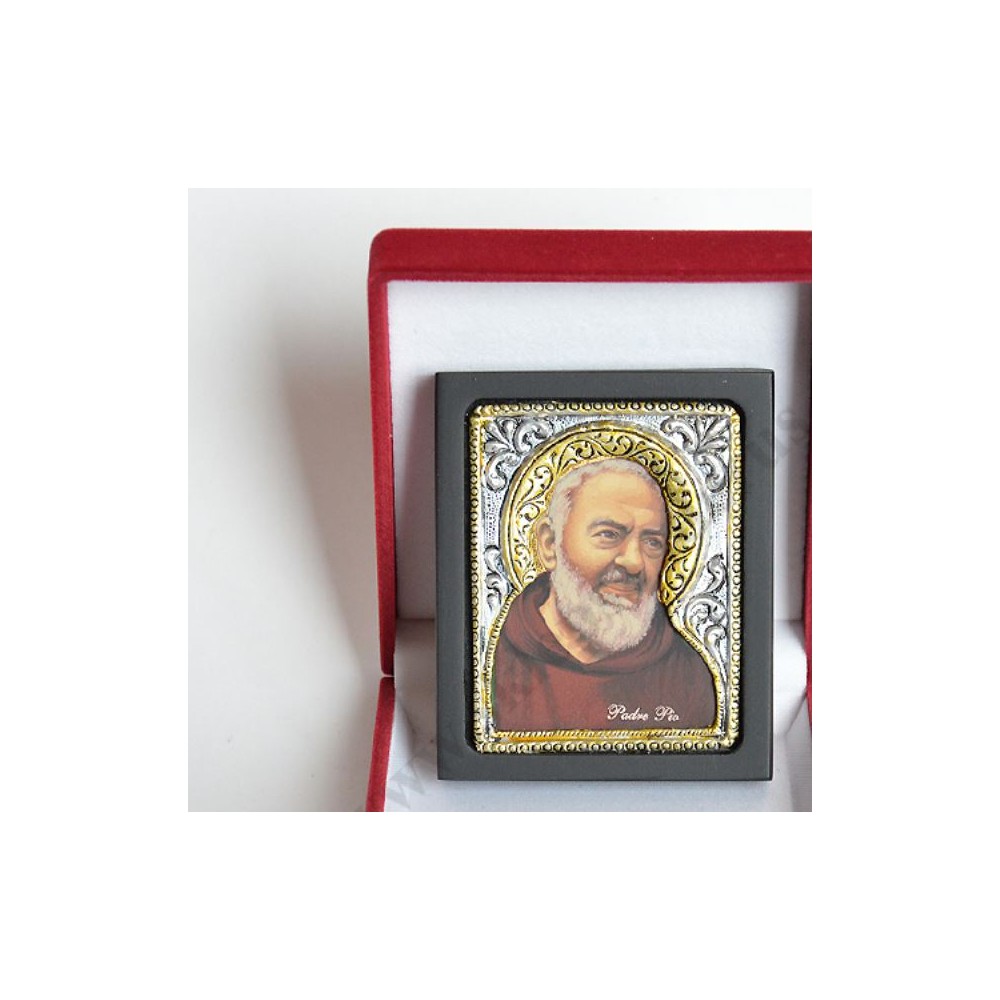 Okazjonalna ikonka Ojca Pio o wymiarach 6.2 x 7.6 cm, wykonana techniką sitodruku w drewnie i płótnie, oprawiona wytłaczanym stopem PVD ze srebrem, pokrytym specjalnym lakierem ochronnym. Ikonka dodatkowo zapakowana jest w eleganckie pudełko o wymiarach 8.5 x 9 cm.